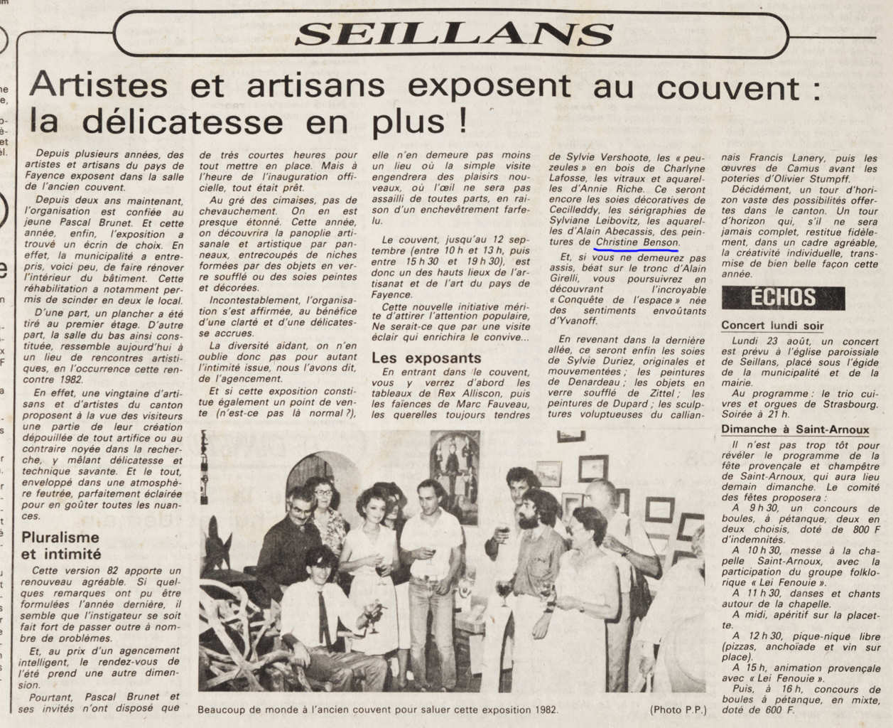 On entering the convent, you will first see the paintings of Rex Alliscon, then the earthenware of Marc Fauveau, the always tender watercolours by Sylvie Vershoote, the wooden “peezeules” by Charlyne Lafosse, the stained glass windows and watercolours by Annie Riche. There will also be decorative silks by Cecilleddy, silkscreens by Sylviane Leibovitz, watercolors by Alain Abecassis and paintings by Christine Benson.