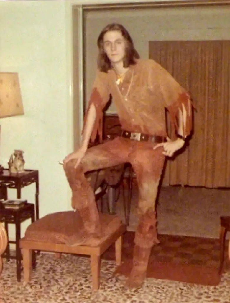 One of the most striking things on viewing the painting is the pose which is very characteristic of Christopher. My mother was particularly proud of getting the realistic perspective or foreshortening required to show my brother’s very long legs in such a compressed space and along with the very natural drape of the wrists and hands, that and the direct gaze, all make for an arresting pose. Next one takes in the striking clothing which are a very real representation of the alterations my brother had made to his formally conventional clothing. The prominent bands of complimentary color in the background represent the human aura that we were all interested in after reading some of the Theosophical Society writings. Overlaying that one can see the large astrological symbol for Taurus and peaking out from behind the aura is a rendition of the ringed planet Saturn, for its astrological representation of ones karma, justice, life lessons and responsibilities and which figured prominently in his Natal chart. Of course, one couldn’t call oneself a hippie without a suitable water pipe or hookah as an aid for ones spiritual explorations. In the upper right is a representative of his spirit guide. He had just finished reading all the books by Lobsang Rampa and was quite taken by them. Next to that is the mantra “Om mani padme hum” written in Tibetan even though I think the intention was for it to be written in Sanskrit. Additionally, in the upper left is the Eye of Horus to represent my brothers study of the myths and legends of ancient Egypt. Around his neck on a leather string, is a simple brass Sun symbol, and relates to his interests in the Inca culture. Overall, one can see he had a fairly eclectic collection of spiritual beliefs and areas of study, a real reflection of the times.