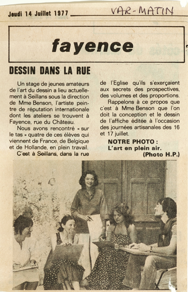 A course for young amateurs in the art of drawing is currently taking place in Seillans under the direction of Mrs. Benson, the internationally renowned painter whose studios are located in Fayence, rue du Château.