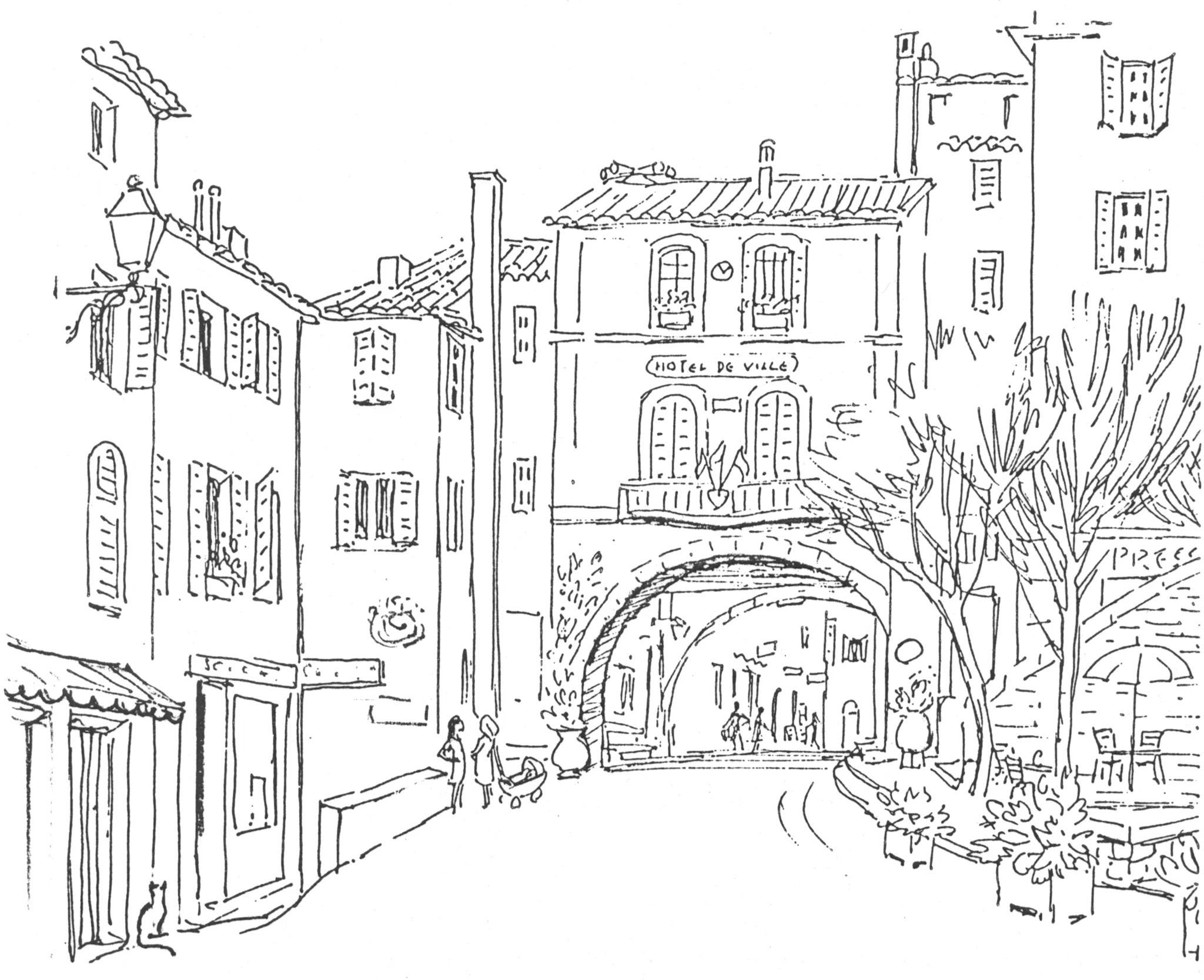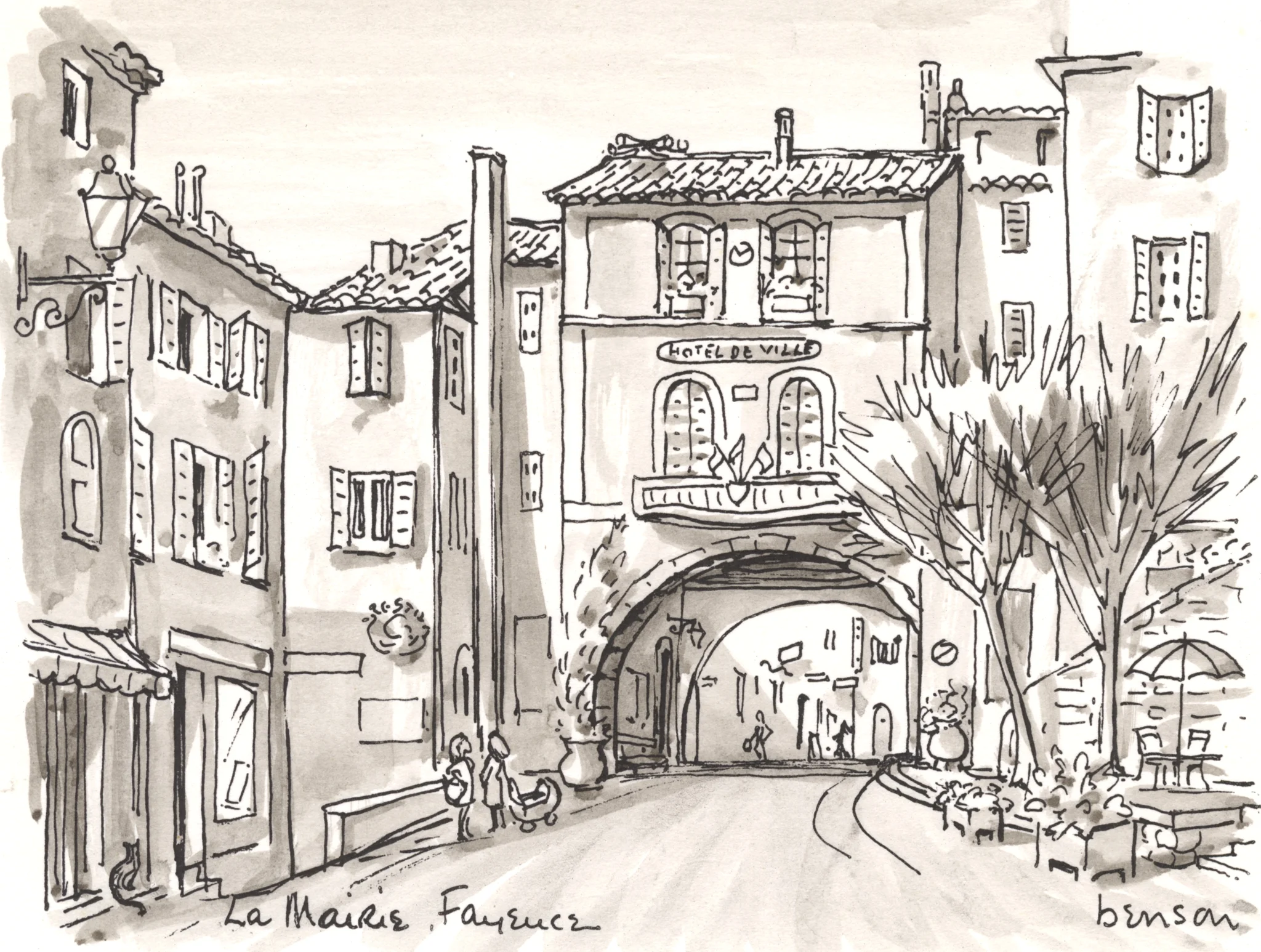 La Mairie, Fayence, was the second painting Christine turned into a professionally printed postcard. This was one of several that she had printed by a company in England. While looking through the files, I found an original monotone version in preparation for printing locally. If it was printed I don’t have any survivors. I also found what I thought was the less expensive line version of the card, but while preparing the images I could see that it was actually a different image of the same scene, with a similar cat and characters added. Similarly, the larger watercolour I have a copy of is yet another version as well…