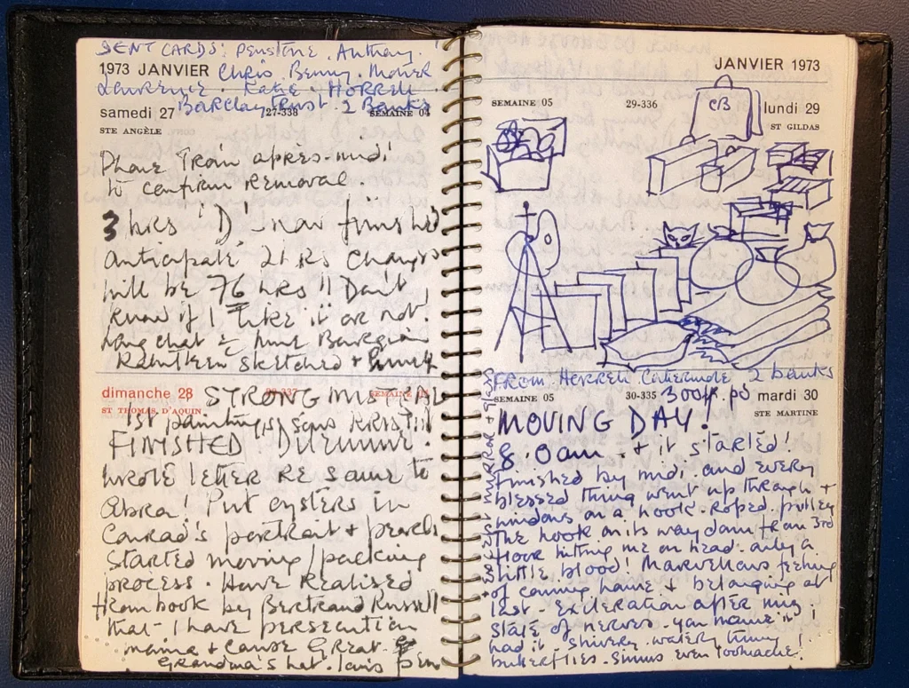| 1/15/1973 | V. dark day. 4½hrs Dilemme. This year I am going to learn bridge – do daily TM’s & yoga – get my french together – and aim at becoming a proficient surrealist painter under name KRISTIN!! |