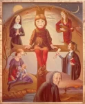 | June 7, 1977 | Work: 6hrs new canvas “Recognition”. Jubilee Day in England – sounds as if the country went mad! Bonfires across the land, street parties, pageantry, hunting and warm emotion to a happy Queen, as I heard on the BBC. For myself, I painted steadily all day except for lunch and a 45 minute nap. Finally got a ‘Pussy cat’ expression on my face – PC again not v. cooperative. In PM tried to get the swirling colors of the aura around the heads after darkening the canvas, didn’t come off- the spiraling idea, so changed it to a blending egg shaped aura enclosing both heads. |
