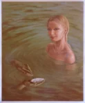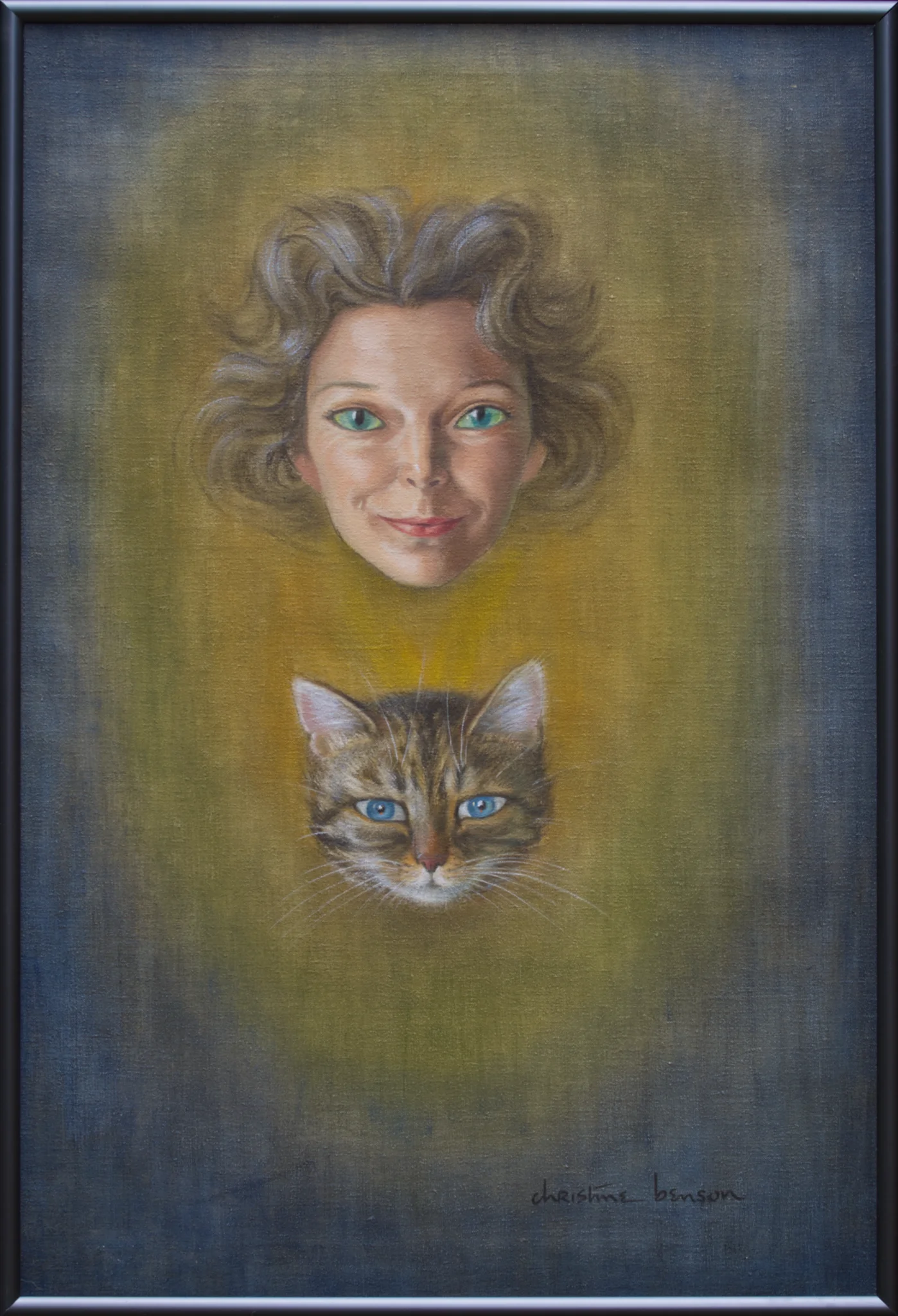 Recognition was another painting based on a dream. In the painting, Christine has altered her own face to give it a more feline look, complete with pseudo ears formed by the waves in her hair. Of course, the most notable feature is the swapping of the eyes between the two of them. In the dream, Christine spoke of feeling that she was a cat in a former life, and so she knew the soul that was now in her cat, hence the title.