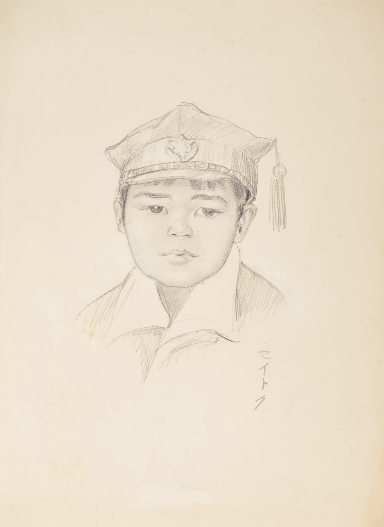 A pencil sketch of a young school boy called Seitoku, possibly the brother of Shizue. Probably one of the children of ours servants while we lived in Okinawa, Japan from 1953 to 1955. He is depicted in his school uniform which included this slightly unusual four cornered cap. The Japanese characters on the drawing translate to his name. At the time my mother was trying to learn some Japanese.