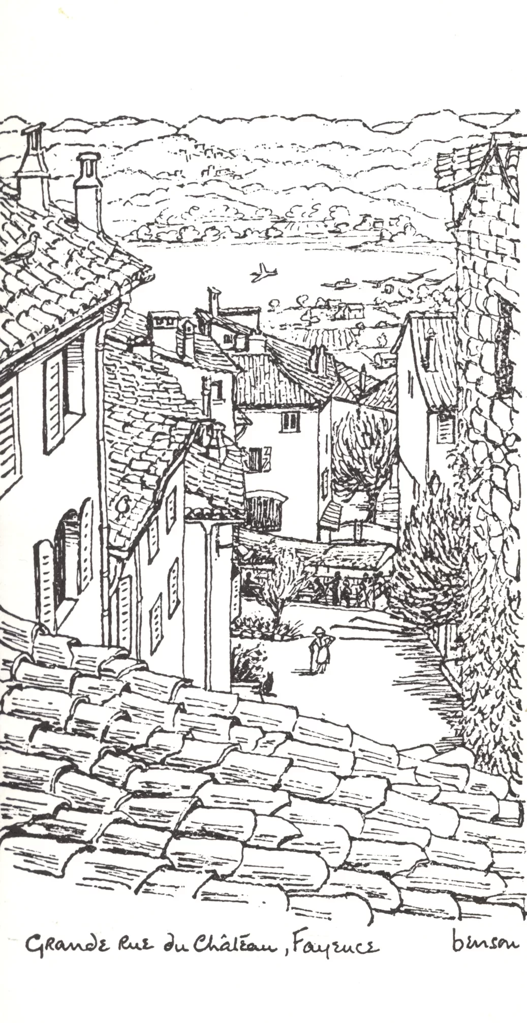 View of the Grande Rue du Chateau – Fayence from Christine’s living room window. It was also one of the images she sent off to be printed by a company in England. For the cards shown below, she worked from the original line drawing to have them produced by some local printers in Grasse. Before the commercial card was printed Christine would painstakingly paint in the color by hand. For a less expensive card, she also sold them as simple line drawings on different colored card stock. I have included with this collection an earlier card she made when she first moved into her apartment. I think she sent it to friends to distribute her new address.